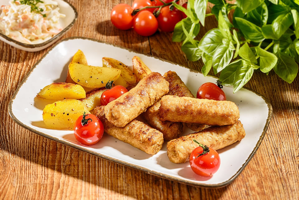 Herzhaft gewürzt, frische Zwiebeln: richtig lecker. Im Konvektomat in nur 8 min von –18°C auf 72°C Ausgabe_x0002_temperatur. Klassisch mit Reis und Gemüse, als Tellermitte oder einfach mit Kraut- und Tomatensalat an Zaziki.