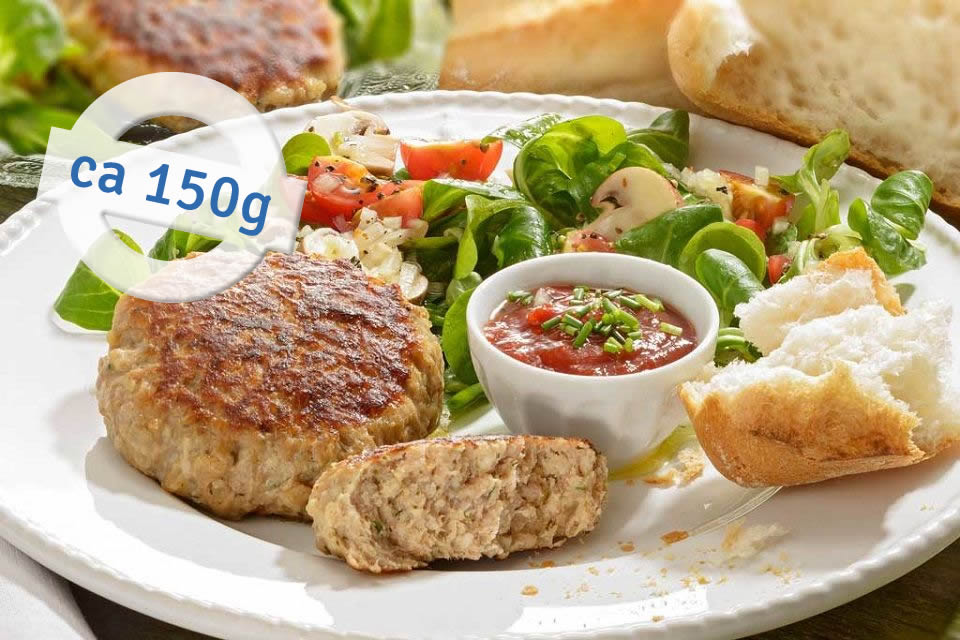 Aus bestem ausgewählten Schweine- und Rindfleisch hergestellt, mit frischen Zwiebeln, Ei und Semmelbröseln. Das Ganze mit frischen Kräutern und Gewürzen fein abgeschmeckt – so macht man Frikadellen! Ohne Fett auf Teflon pfannengebraten und direkt einzeln schockgefrostet – so ist es für alle leicht und lecker.
